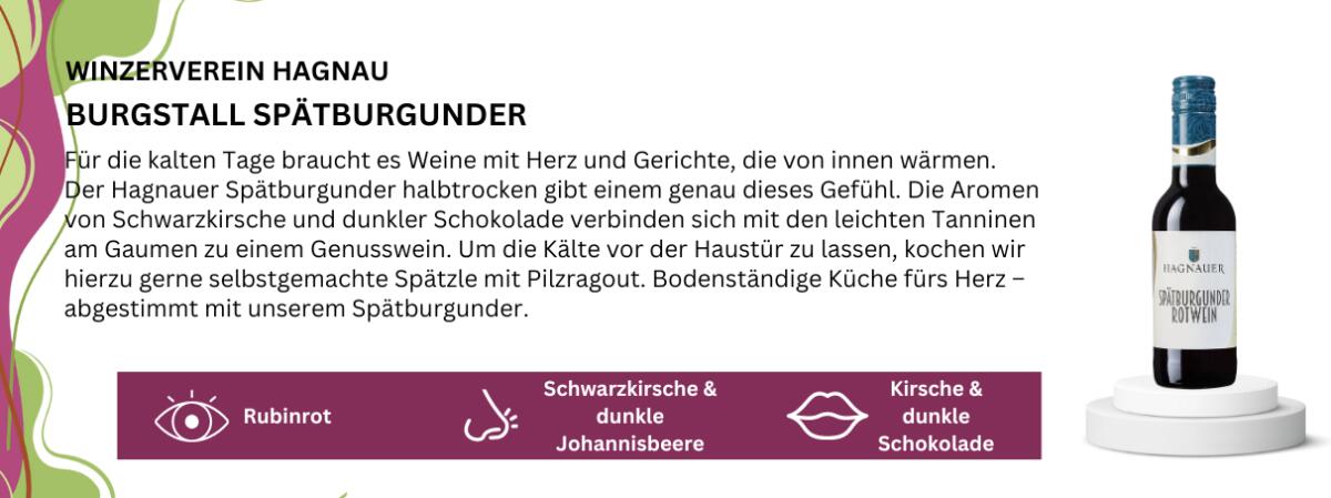 Für die kalten Tage braucht es Weine mit Herz und Gerichte, die von innen wärmen. Der Hagnauer Spätburgunder halbtrocken gibt einem genau dieses Gefühl. Die Aromen von Schwarzkirsche und dunkler Schokolade verbinden sich mit den leichten Tanninen am Gaumen zu einem Genusswein. Um die Kälte vor der Haustür zu lassen, kochen wir hierzu gerne selbstgemachte Spätzle mit Pilzragout. Bodenständige Küche fürs Herz – abgestimmt mit unserem Spätburgunder.